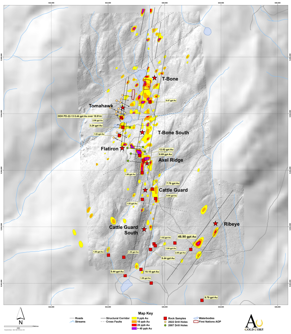 - Recently revised interpretation of the Ponderosa Structural Corridor: ~2 km north-trending en-echelon gold/arsenic soil geochemical anomalies